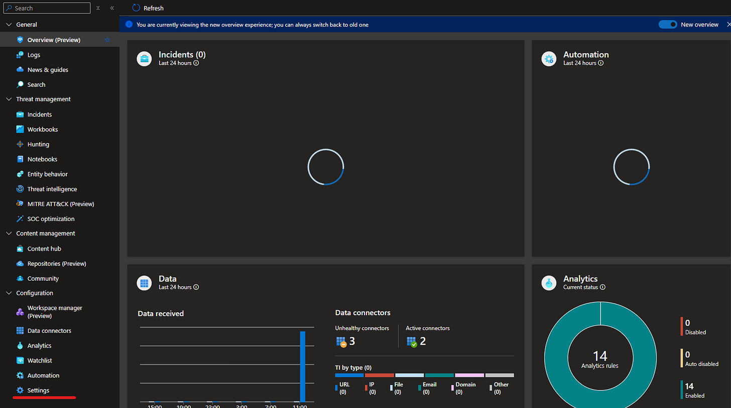From the Sentinel main page, select “Settings” in the Configuration section on the left-hand flyout.