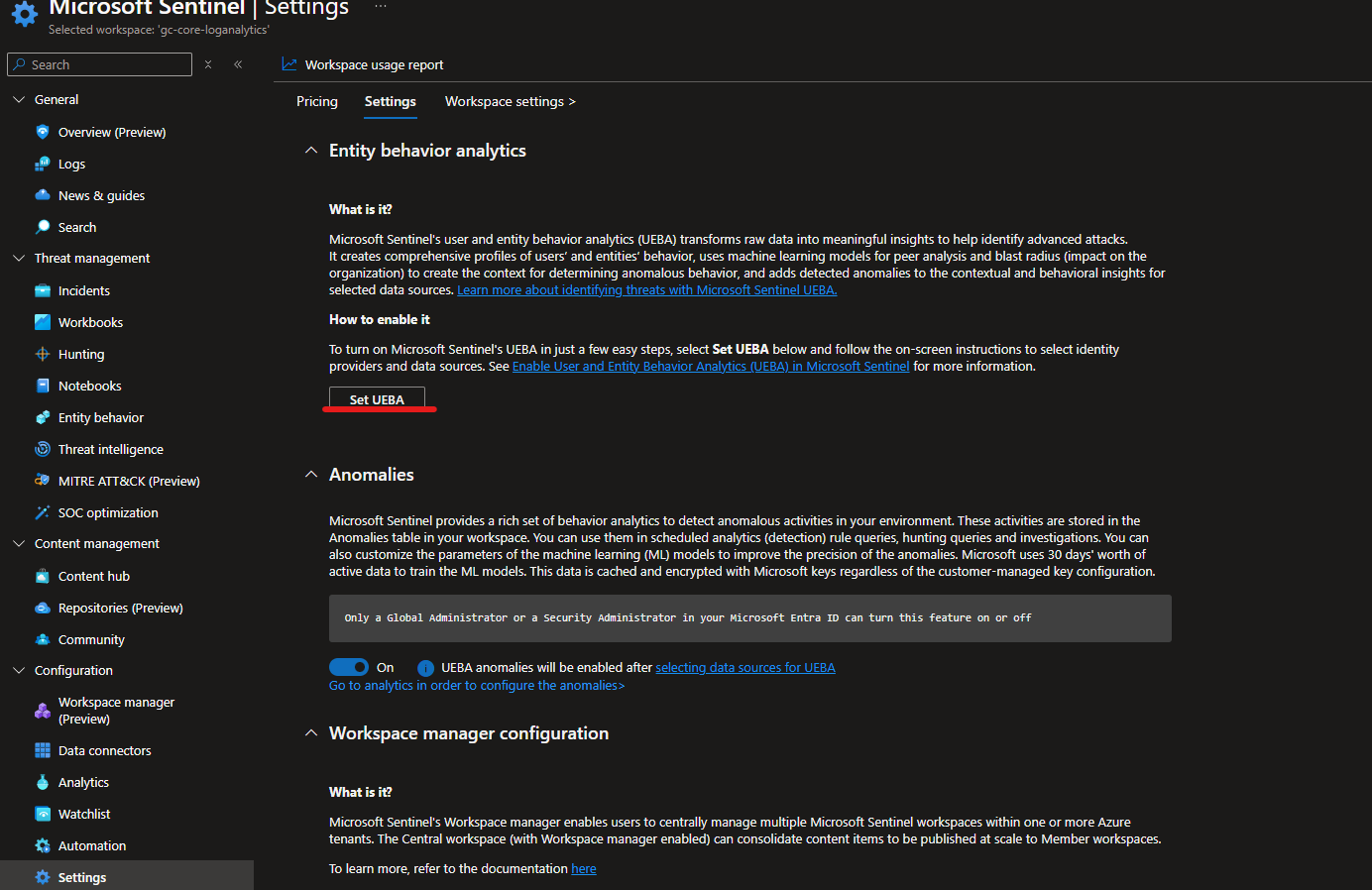 Inside the “Settings” window, select the “Settings” tab and click “Set UEBA” under “Entity Behavior Analytics”